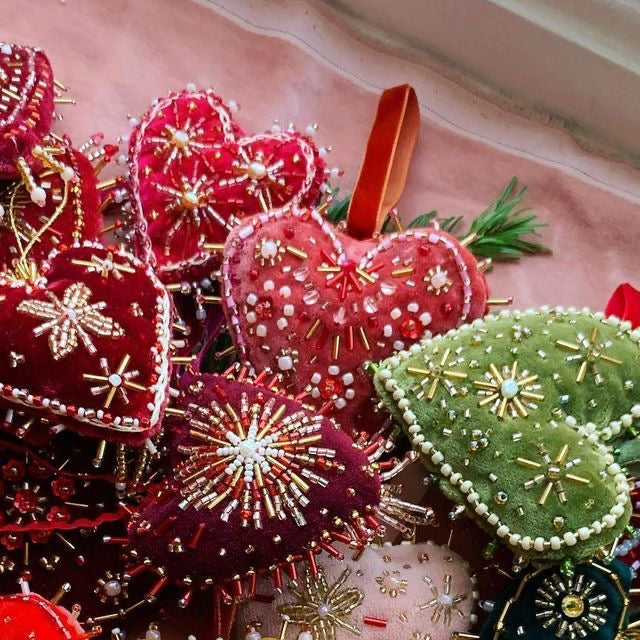Chaveiro bordado à mão, com aplicação delicada de miçangas e acabamento em tecido macio. Cada peça é feita artesanalmente, com ferragem dourada ou prata, escolhida para complementar a estética do bordado.