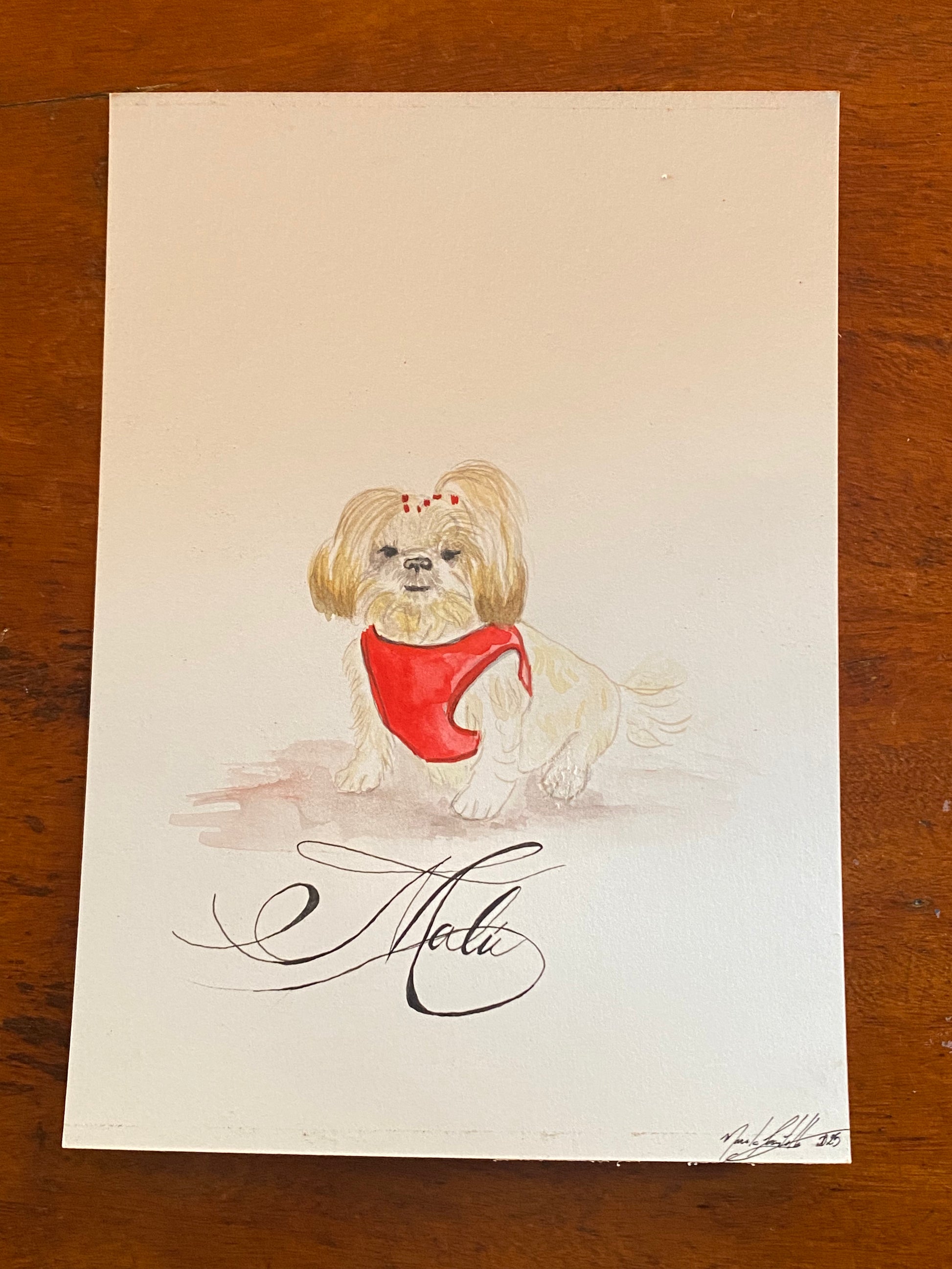 Uma aquarela delicada criada a partir da foto do seu pet. Cada retrato é pintado à mão, respeitando a personalidade, as cores e a expressão única do seu companheiro.